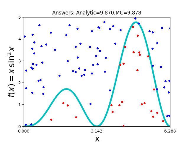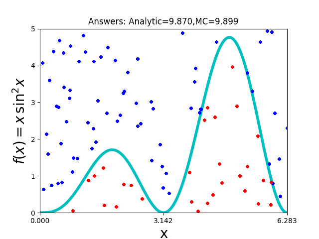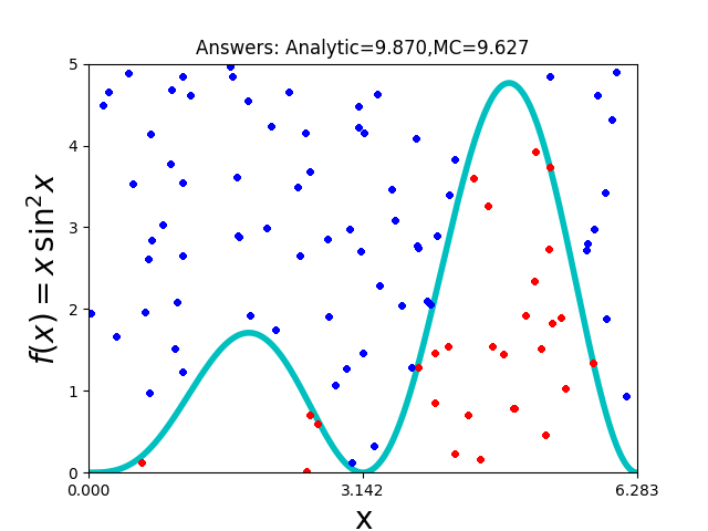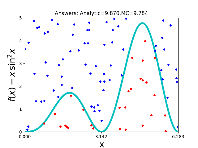 彼は言った。「素晴らしいところに気付いた。一つ言っておくと、この点はランダムに打たれている。もし、ランダムに打たれる点の数をすごく増やせばどうなるだろう?この図で、曲線の上が青に塗りつぶされ、曲線の下が赤に塗りつぶされるだろう。そうして赤の点の数を数えたら、なにが分かるだろうか」と。