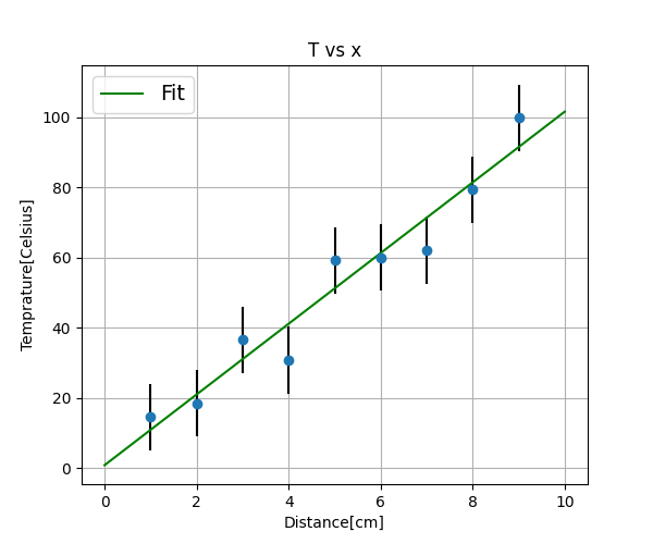 図は、温められた棒の端(Distance=0)から温度(Temparature)を計った結果得られた実験データである。青い丸がまず生のデータで、それに最小二乗法を実施し緑色の直線をひいた。