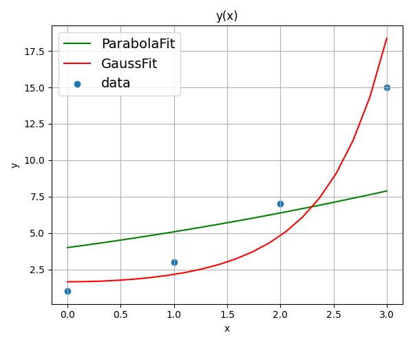 緑の線は放物線だが、そうは見えないくらい直線に近い。アルゴリズムが間違っていたのだろうか。一方、赤い曲線がガウス型関数、A*exp(-b*x^2)でフィッテングさせたものである。こちらは、どうやら綺麗にデータに沿っているように見える(見える、だけであって、実際はもっと別の関数でフィッテングできるかもしれない)。