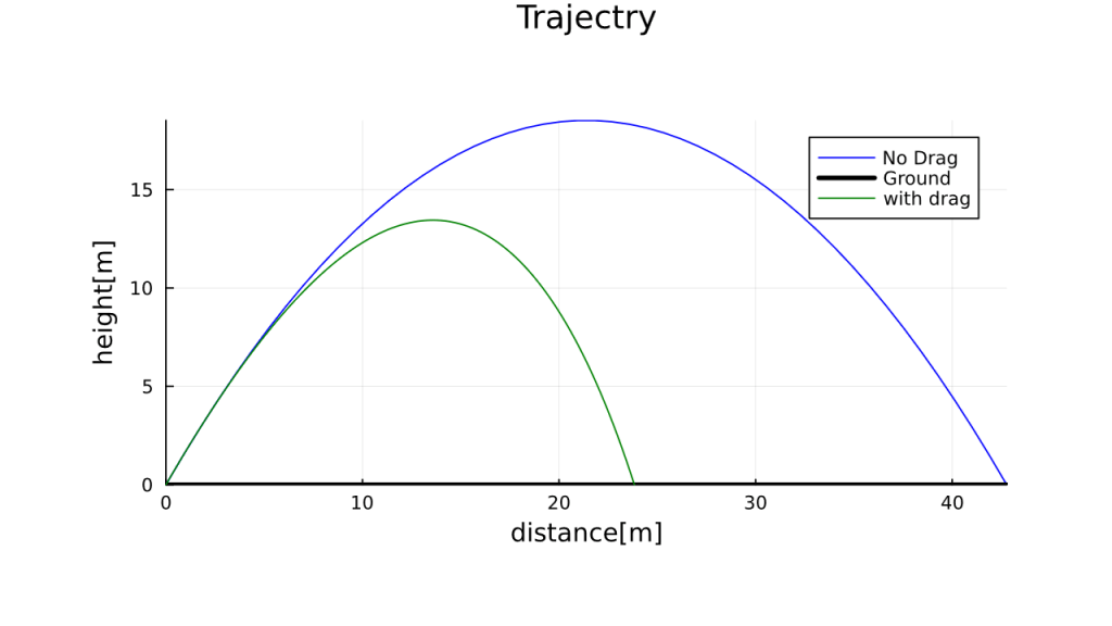 ただしここでvx,vyはそれぞれ物体の水平速度、鉛直速度である。大雑把に言えば、kは空気抵抗の大きさ、nは速度によって空気抵抗がどれくらい強くなるかを表す。gはもちろん重力加速度である。