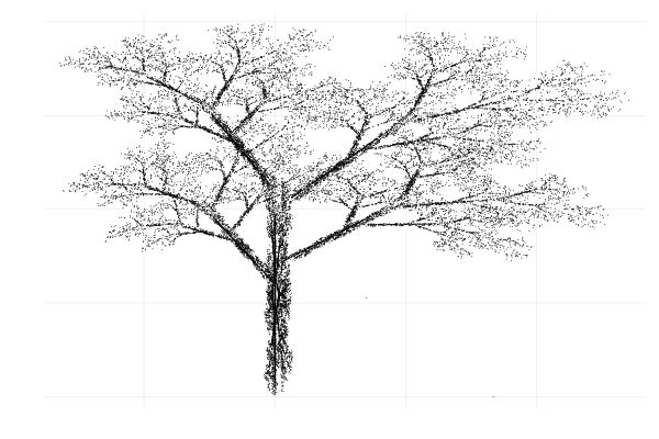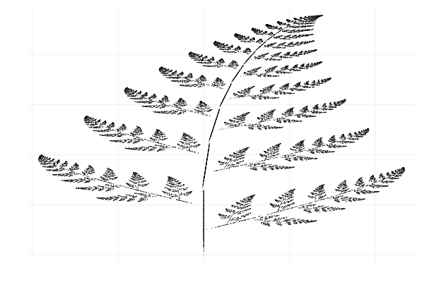 JuliaでPlotsパッケージを用い、描いた。プログラムのコードとしては40行ほど。それなのに、こんなに美しいシダが描けるなんて。私はびっくりした。コードを書いている途中は、どんな図になるのか全く想像できなかった。反復と条件分岐が得意なコンピュータのおかげである。